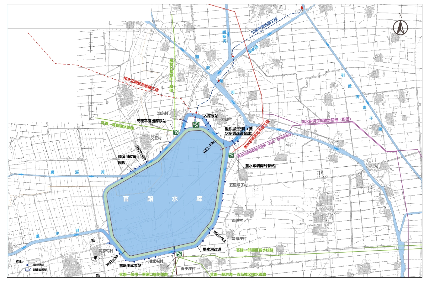 工程位于青島膠州市西北的墨水河下游,北距平度市城區30km,南距膠州市城區15km,西距高密市城區18km。工程主要任務是近期調蓄黃水東調工程水量、當地雨洪水資源以及引黃濟青干渠輸送的山東省統籌調配的客水,為青島市城鎮生活及工業用水提供水源;遠期在雨洪水和黃水東調水量基礎上,新增調蓄山東省統籌調配的南水北調等客水,滿足青島供水需求,并兼顧高密市的部分用水需求。工程規模為大(2)型,共涉及膠州市、高密市、平度市三個縣級市。水庫總庫容2.11億立方米,死庫容0.19億立方米 ,興利庫容1.92億立方米。總投資約91.45億元,主要建筑物包括水庫圍壩、入庫泵站、青島出庫泵站、高密出庫泵站、泄水洞、墨水河及順溪河改道、引黃濟青連接暗渠等,項目建設期3年。